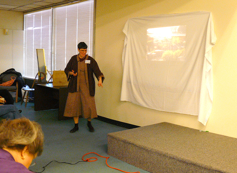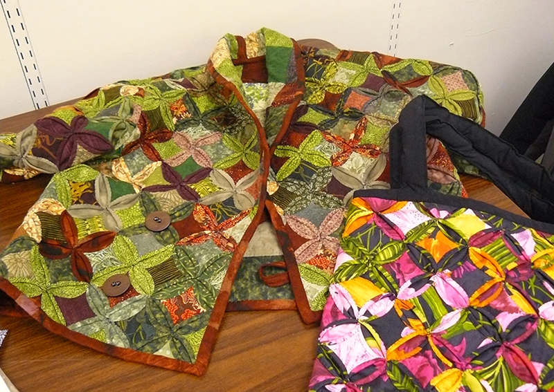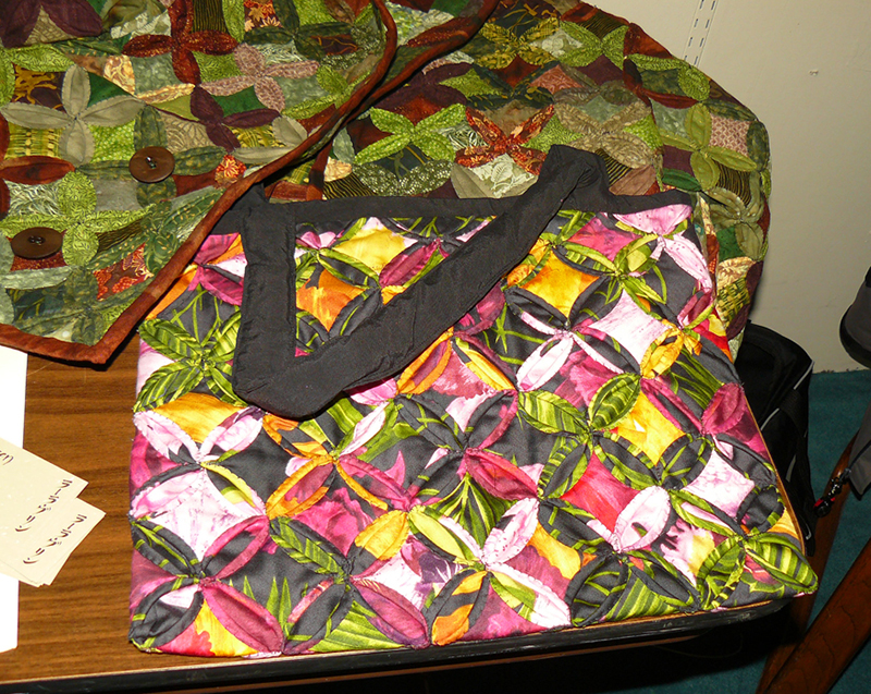 The workshop was very well attended by a wonderful, very talkative group. Using simple folding and handsewing techniques—we decided some of this can be done on the machine—we each created a beautiful, textural piece of cloth. Though our sample piece was small, it was large enough to construct a clutch purse. The technique can be adapted to any size so it’s possible to stitch any size you’d like. The quilted pieces can be inserted into a garment, made into a totebag or expanded to be part of a jacket. Lara brought a sample jacket that was stunning to say the least.